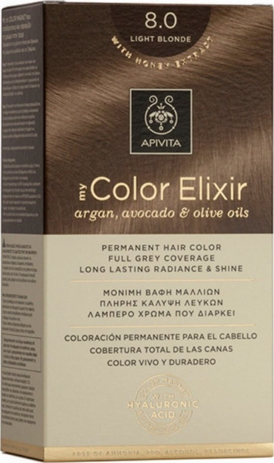 Μόνιμη βαφή μαλλιών Apivita My Color Elixir 8.0 Ξανθό Ανοιχτό, ειδικά σχεδιασμένη με γνώμονα τη φυσικότητα, το επαγγελματικό αποτέλεσμα και με απόλυτο σεβασμό στο τριχωτό.