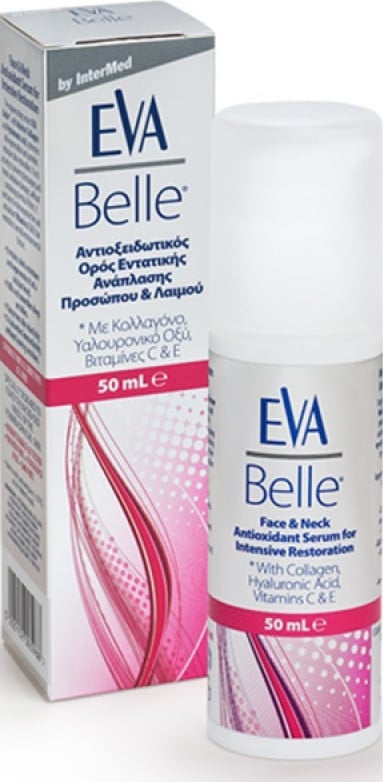 Αντιοξειδωτικός ορός Intermed Eva Belle Serum εντατικής ανάπλασης προσώπου & λαιμού. Με ισοφλαβόνες σόγιας, κολλαγόνο, υαλουρονικό οξύ, βιταμίνες C & E.