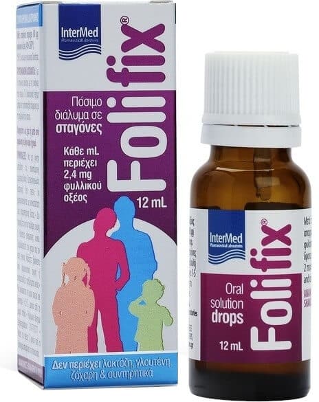Πόσιμο συμπλήρωμα διατροφής φυλλικού οξέος Intermed Folifix drops σε σταγόνες, για τη συμπλήρωση των καθημερινών αναγκών του οργανισμού σε φολικό οξύ. Κατάλληλο για όλες τις ηλικίες και κατά τη διάρκεια της εγκυμοσύνης.
