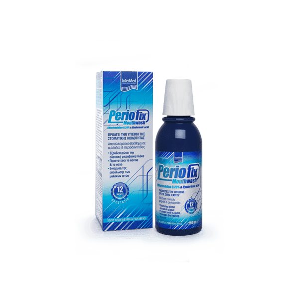 To στοματικό διάλυμα Intermed Periofix 0.20% με χλωρεξιδίνη και υαλουρονικό οξύ, δημιουργήθηκε για τον δραστικό έλεγχο και την εξουδετέρωση των μικροοργανισμών της στοματοφαρυγγικής κοιλότητας.