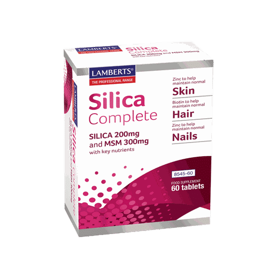 Το Silica Complete αποτελεί μια ειδικά σχεδιασμένη φόρμουλα από το Επιστημονικό Τμήμα της Lamberts καθώς περιέχει Ψευδάργυρο (συμβάλλει στην διατήρηση της υγείας των μαλλιών και των νυχιών*), Βιοτίνη (συμβάλλει στην διατήρηση της υγείας τoυ δέρματος*) και Βιταμίνη C ( συμβάλλει στην φυσιολογική σύνθεση του κολλαγόνου*).