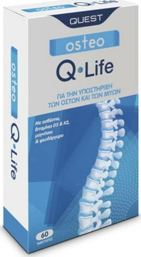 Συμπλήρωμα διατροφής Quest Naturapharma Osteo Q Life που συνδυάζει τις πιο σημαντικές βιταμίνες και μέταλλα για την καλή λειτουργία των οστών και των μυών.