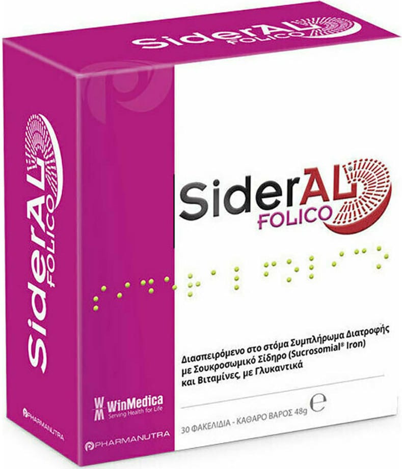 Συμπλήρωμα διατροφής Winmedica Sideral Folico 30 φακελ. για την αντιμετώπιση της έλλειψης σιδήρου και φυλλικού οξέως, τα οποία αποτελούν απαραίτητα διατροφικά συστατικά για τον ανθρώπινο οργανισμό σε όλη τη διάρκεια της ζωής.