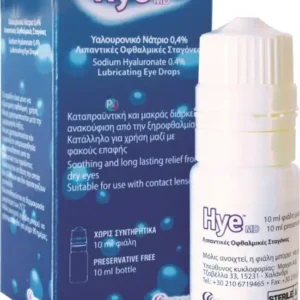 Λιπαντικές Οφθαλμικές Σταγόνες Hye MD. Οι λιπαντικές, ενυδατικές και προστατευτικές ιδιότητες του Υαλουρονικού νατρίου σε συνδυασμό με τα ποιοτικά χαρακτηριστικά των chamomile, Witch-Hazel και Cornflower αναζωογονούν, ανακουφίζουν και ηρεμούν τα μάτια από ερεθυσμούς , ξηρότητα, αίσθηση…